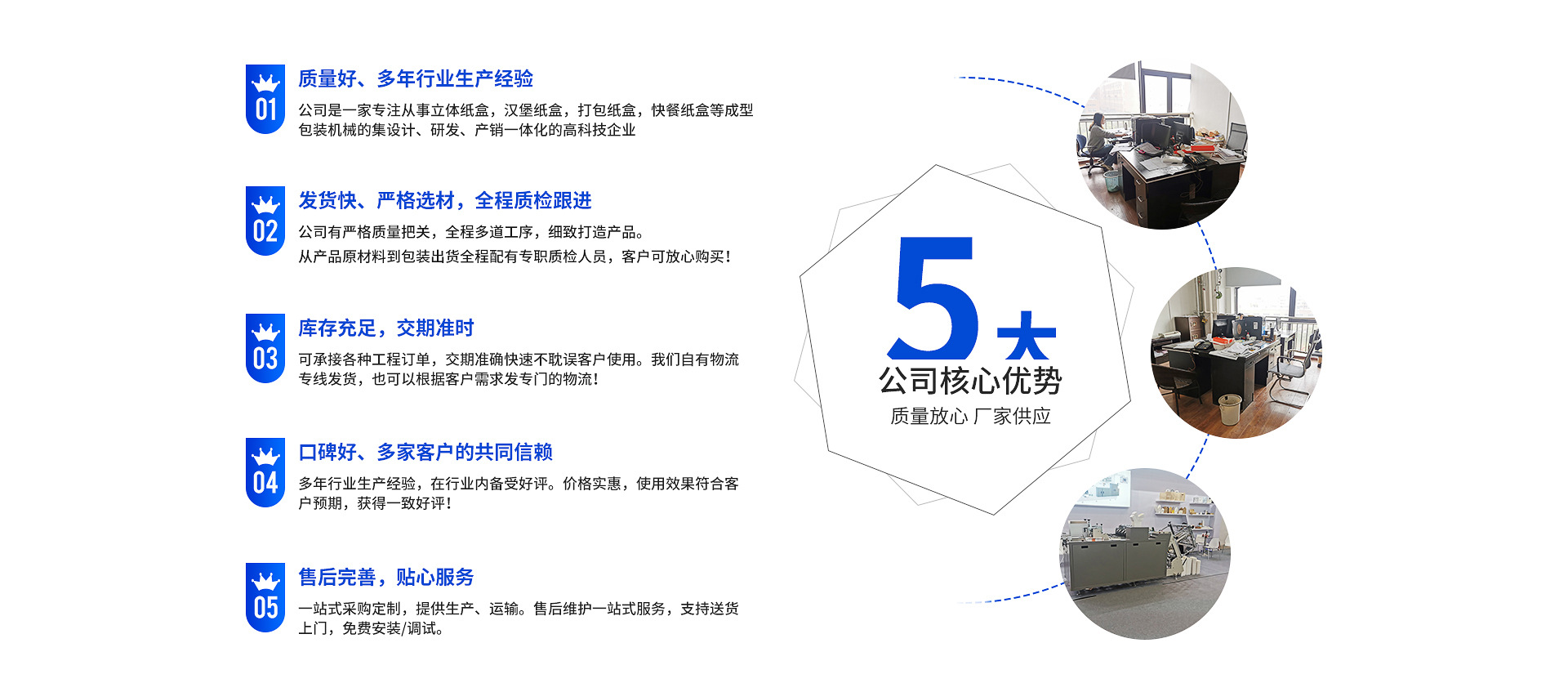 瑞安市中法機(jī)械有限公司是一家從事立體紙盒機(jī),漢堡紙盒機(jī),打包紙盒機(jī),快餐紙盒機(jī)等成型包裝機(jī)械的設(shè)計(jì)、研發(fā)、產(chǎn)銷一體化的高科技企業(yè)。公司有現(xiàn)代化的管理體系和完善的售后服務(wù)體系;有一支具有充滿青春活力的精銳研發(fā)團(tuán)隊(duì)!自成立以來,中法公司堅(jiān)守“誠(chéng)信、學(xué)習(xí)、發(fā)展”的企業(yè)發(fā)展理念,堅(jiān)持“以誠(chéng)信為道、以質(zhì)優(yōu)取勝”的經(jīng)營(yíng)原則,在市場(chǎng)競(jìng)爭(zhēng)中取得了良好的社會(huì)和經(jīng)濟(jì)效益!